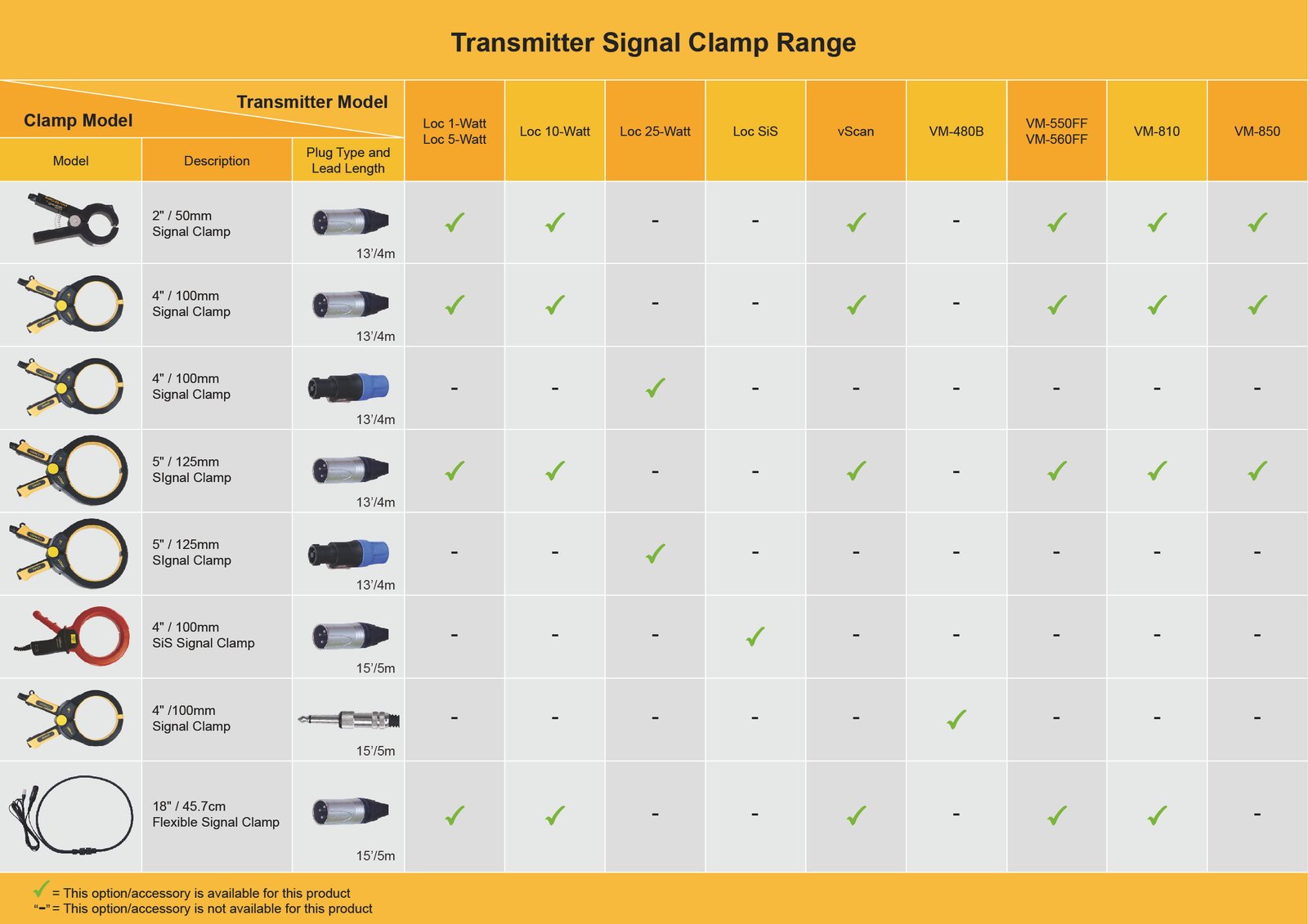 Signal Clamps are specialized inductive devices, sometimes known as a toroid or coupler. All clamps are optimized to work at specific frequencies. In most cases, clamps are designed to be used at frequencies generally between 8 kHz and 83.1 kHz.