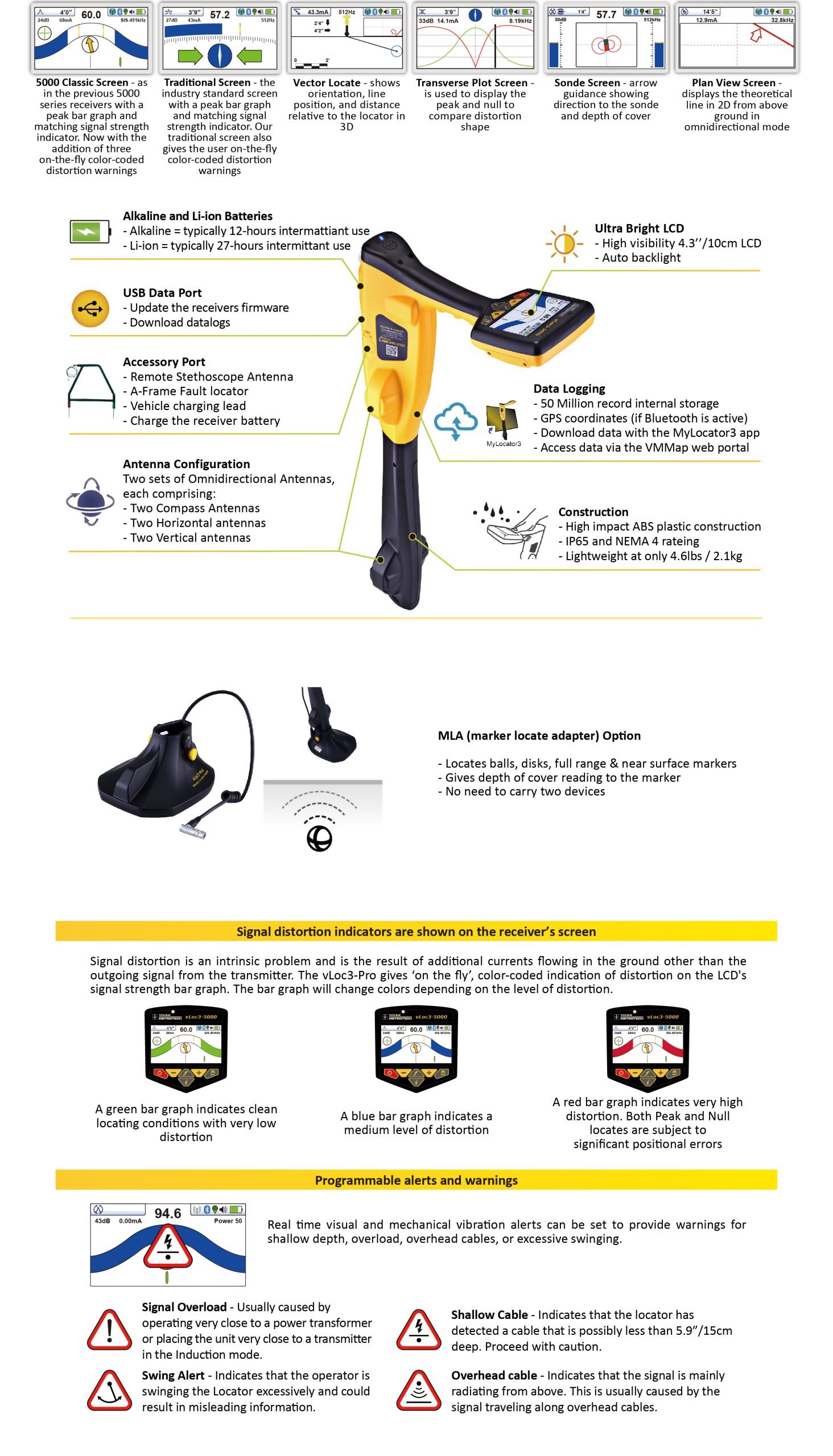 The highly user configurable vLoc3-5000 contains eight passive locate modes, fault-find mode, SD (showing direction of outgoing current), Signal Select™ real-time measurement of signal bleed-over caused by capacitive or inductive coupling to other utilities, and a range of configurable frequencies from 98Hz to 200 kHz. Audio and mechanical vibration alerts can also be configured by the user providing warnings for shallow depth, overload, overhead cables, and excessive swinging. Plug-in-play options for the receiver include optional Bluetooth module useable with external GPS devices and EMS foot to locate buried markers.