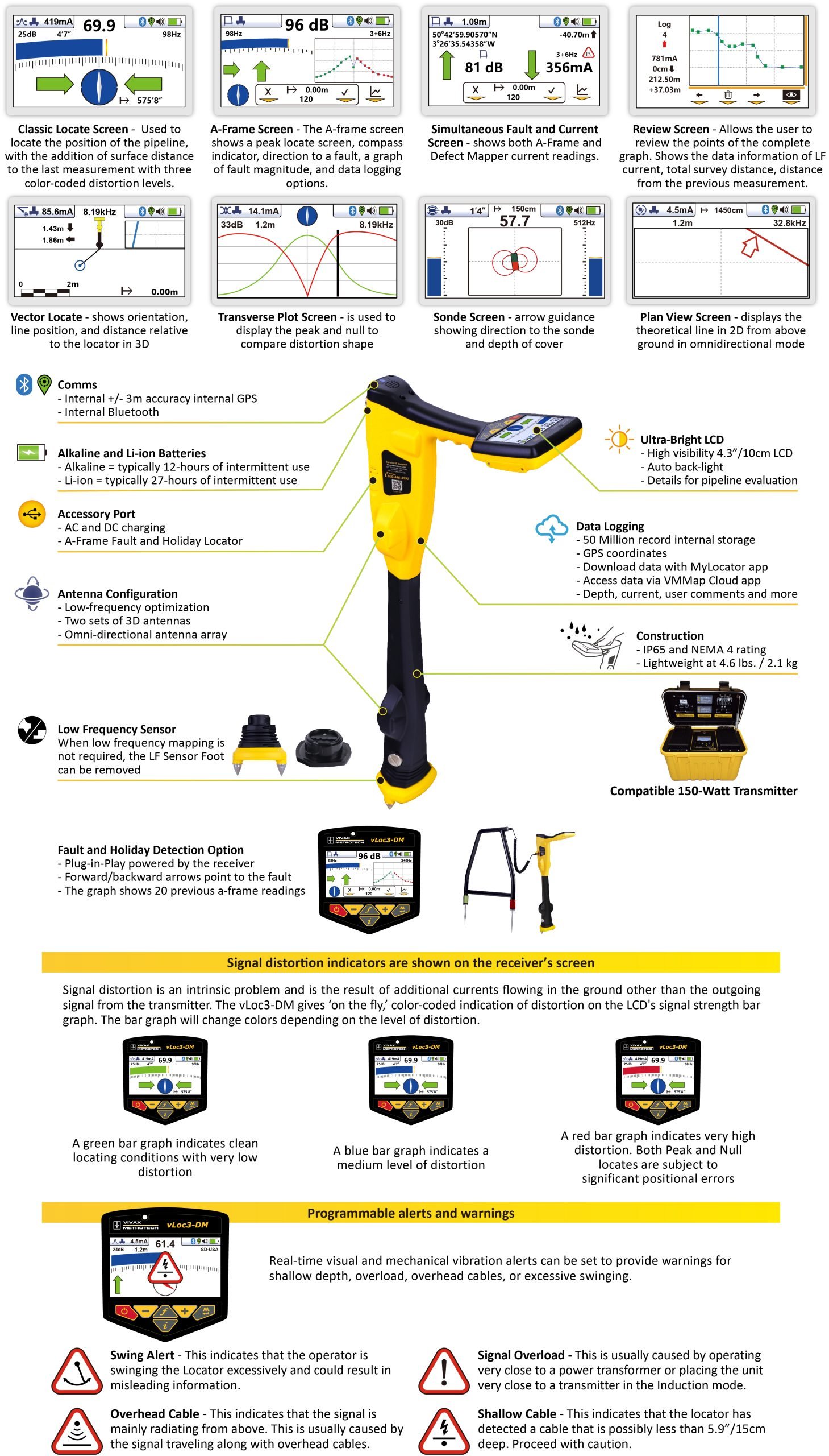 With two sets of 3D antennas, signal distortion is easily detected and displayed on the bright full-color display. The vLoc3-DM introduces new locate perspective screens of Vector Locate for fully automatic non-walk over locating, Transverse Graph showing both peak and null simultaneously providing an immediate measurement of signal distortion, and Plan View showing the relative orientation of the cable at any angle. Visual and mechanical vibration alerts can also be configured by the user providing warnings for shallow depth, overload, overhead cables, and excessive swinging.