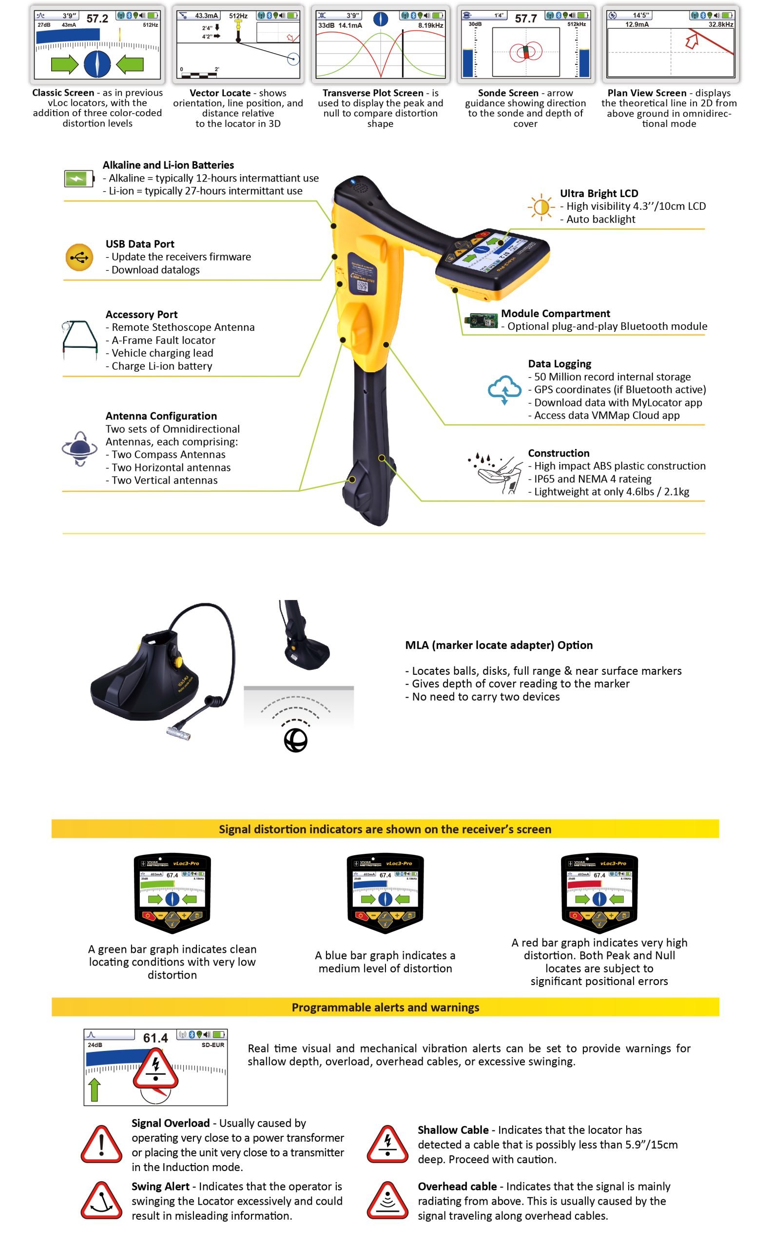 The highly user configurable vLoc3 series contains eight passive locate modes, fault-find mode, SD (showing direction of outgoing current), and a range of configurable frequencies from 98Hz to 200 kHz. Audio and mechanical vibration alerts can also be configured by the user providing warnings for shallow depth, overload, overhead cables, and excessive swinging. Plug-in-play options for the receiver include optional Bluetooth module useable with external GPS devices and EMS foot to locate buried markers.