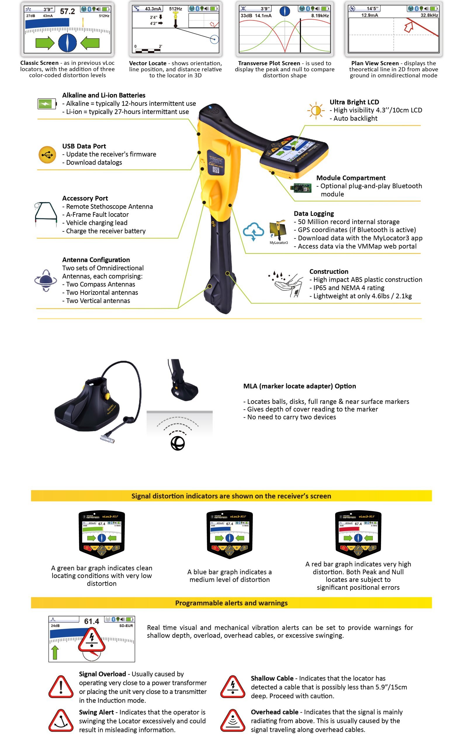 The highly user-configurable vLoc3 series contains eight passive locate modes, fault-find mode, and a range of configurable frequencies from 32Hz to 32.8kHz. Visual and mechanical vibration alerts can also be configured by the user providing warnings for shallow depth, overload, overhead cables, and excessive swinging. Plug-in-play options for the receiver include an optional Bluetooth module usable with external GPS devices and the vLoc3-MLA (marker locator adapter), which plugs into the accessory socket to locate buried markers.