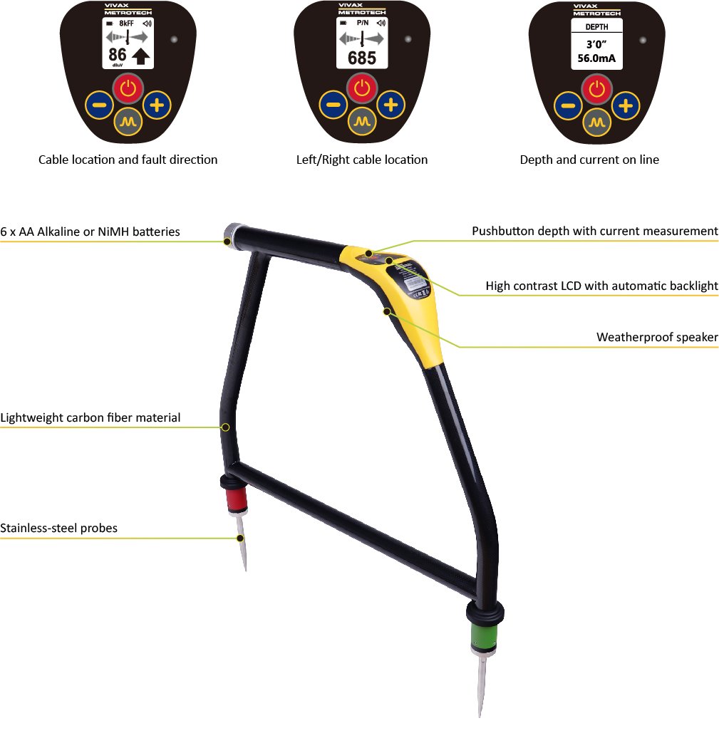 Finding the location of an underground cable fault just became easier with the VM-510FFL+ Standalone A-frame locator. Now locating a suspect cable and finding the fault can be done with the VM-510FFL+ and a compatible transmitter. There is no longer a need for a separate utility locator with cables connecting to it. After connecting a compatible transmitter to the line and placing it in a Fault-Find mode, use the simple to operate four button controls of the VM-510FFL+ to locate and stay on the cable path while pinpointing the sheath or ground fault.